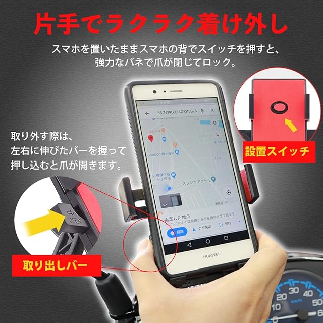【片手でスマホを着け外し】スマホを置いて押すと、強力なバネで爪が閉じて自動ロック。取り外しも片手でラクラク