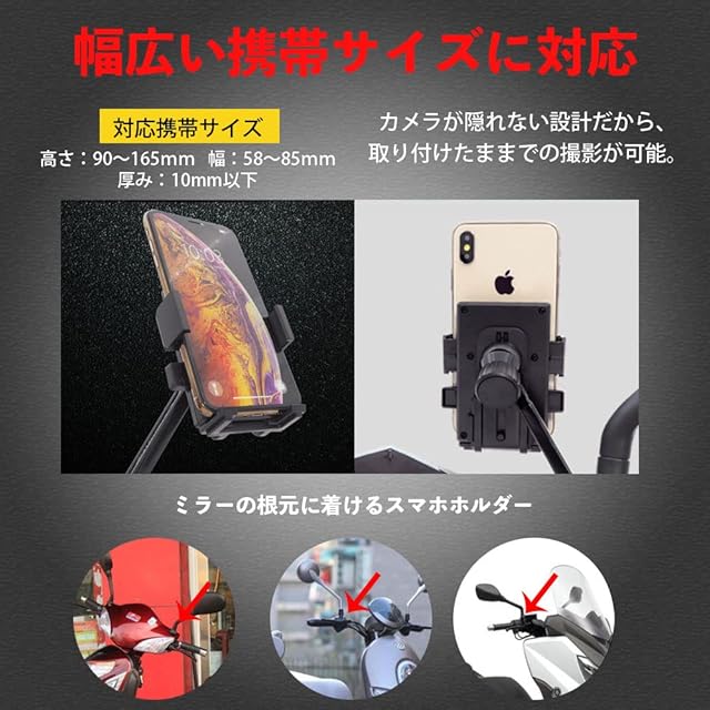 【原付・スクーター専用品】ハンドルバーがない原付バイクにも設置できる、ミラーの根元に着けるタイプのスマホホルダーです