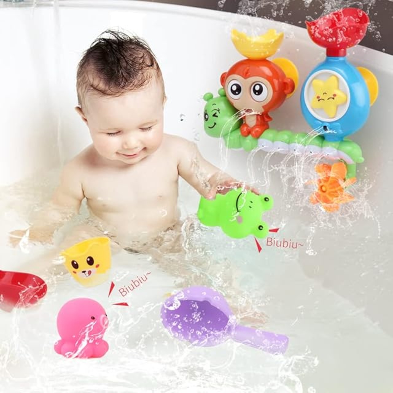 【面白い水遊び】電池不要で 水を動力として コップと柄杓で水を注ぐ 水車がくるくる回リ 動物の眼球と星もくるくる回します。本体からシャワーのような水が流して 遊びなからお子様の手先の訓練に役に立ち お風呂タイムをもっと楽しくします!