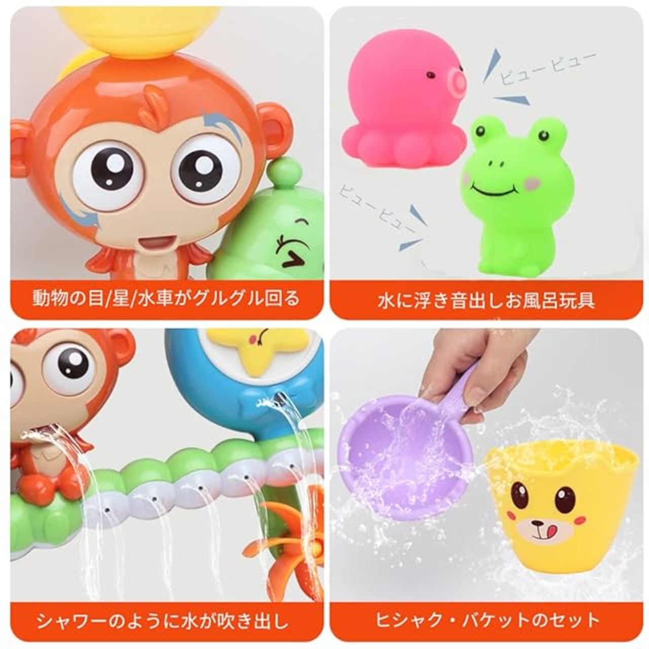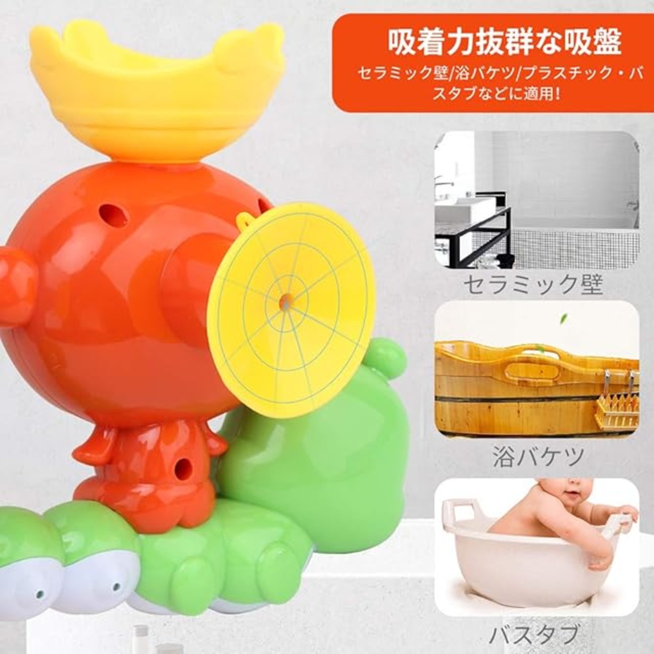 <br>【お風呂嫌い解消】「お風呂は楽しい時間だよ」と感じてもらいお風呂おもちゃです。<br>お風呂に飽きて、すぐ出たがるお子様に入浴時間を楽しみになりましょう! <br>【セット内容】水車本体(吸盤二つ付き)×1、ヒシャク×1、バケット×1、浮かぶ動物玩具×2 <br>【面白い水遊び】電池不要で 水を動力として 入れると 水車がグルグル回る 動物の眼球と星も回転します。<br>本体からシャワーのような水が流して 遊びなからお子様の手先の訓練に役に立ち <br>お風呂タイムをもっと楽しくします! <br>【吸盤が吸着力抜群】二つの吸盤付き お風呂場の平滑面に吸着して固定具が必要なく とても安定です。<br>吸盤で壁に取り付けが便利なので、分解して洗えるのも簡単ですので 使わない時清潔に保管できます。 <br>【お子様にプレゼントおすすめ】環境に優れた高品質ABSプラスチック素材を採用しており 無毒で丈夫です! <br>お子様でも小さい子でも安心して使っていただけます。