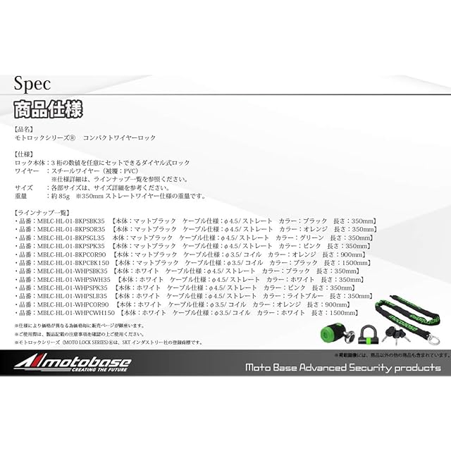 モトベース(MOTO BASE)盗難防止用品 モトロックシリーズ コンパクトワイヤーロック MBLC-HL-01(φ3.5×900mm:ホワイト/ホワイト)MBLC-HL-01-WHPCWH90 | HiKaRiストア
