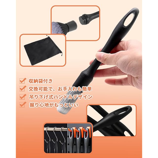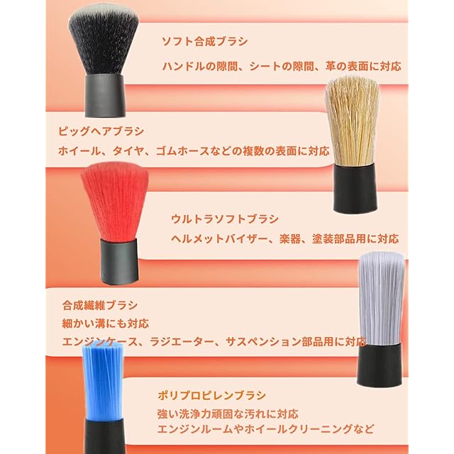 【替えブラシ可能】車用ブラシ2本+余分な替えブラシ3本。耐久性が優れている繊維と天然の豚毛から作られるブラシについて、柔らかいブラシから硬さがあるブラシまで付属されております。また、3つの交換ブラシも追加され、ブラシを替え使いますので、長くお持ちます。
