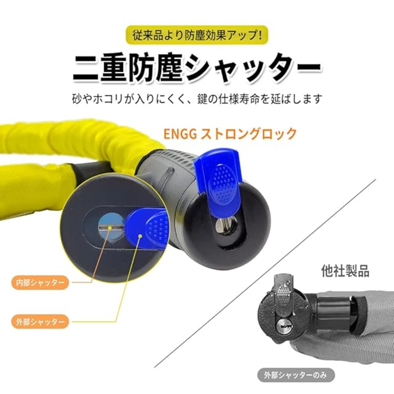 【二重防塵シャッター】他社にはホコリや砂がシリンダーに入り解錠不能になったとのクレームがよくありますが、ENGGは従来品より防塵性能を強化しました。通常の防塵シャッター以外にシリンダーの入口にもう一つの防塵カバーを設置しホコリや砂の侵入を更に減少、シリンダーの使用寿命を延長しました。