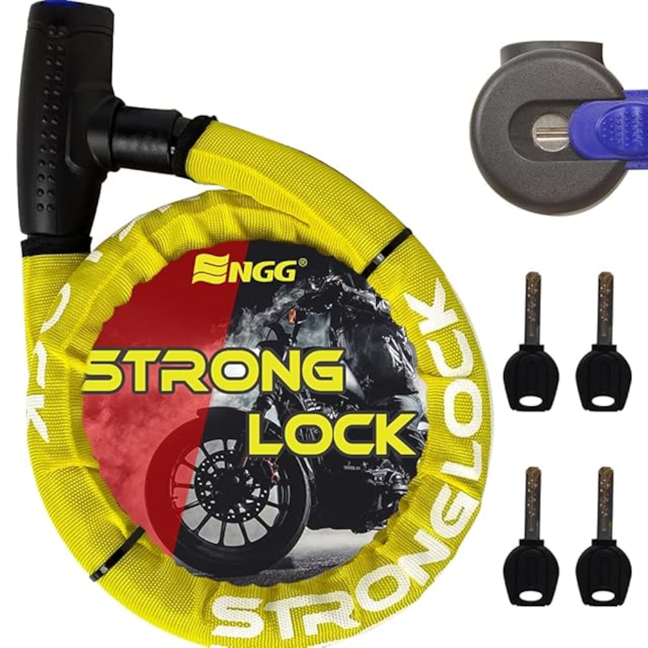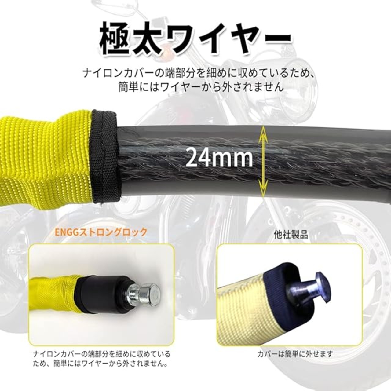 ENGG バイクロック ワイヤーロック 極太 直径24mmx1200mm 二重防塵 ウェーブキー4本付き 頑丈 盗難防止 オートバイ 原付 チェーンロック
