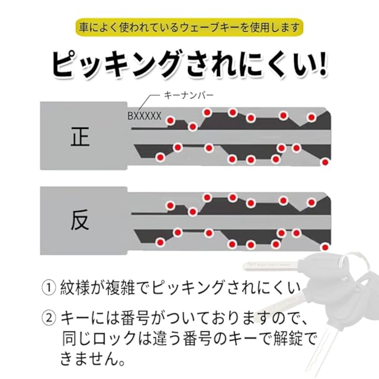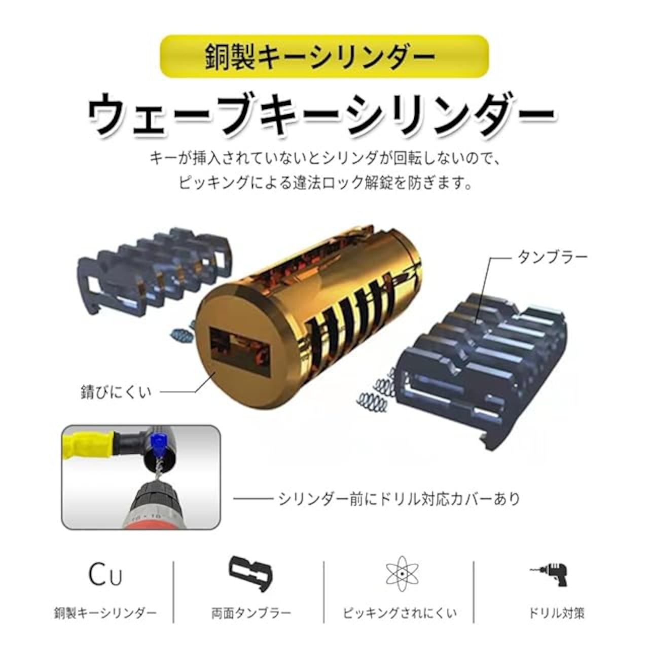 【防盗シリンダー】ウェーブキーシリンダを採用しており、タンブラー数が多く、ピッキングしにくく、プロの窃盗でも開けるにはかなりの手間がかかります。更に鍵穴には金属カバーがあるため、ドリルによる解錠の対策もバッチリです。【銅製シリンダー】シリンダー部分は銅製で錆にくく、防水性と耐久性に優れています。