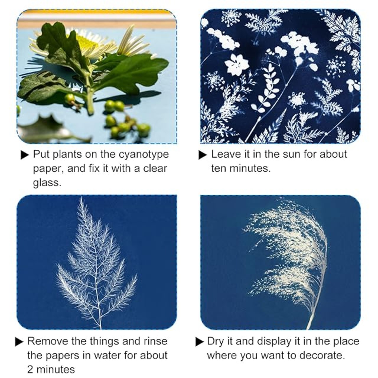 説明: 1. シアノタイプ紙の上に植物などを置き、透明なガラスまたはアクリル板で固定します。2. 約10分間太陽の下に置きます。3. 物を取り除き、紙を水で約2分間すすぐと、画像が表示されます。4. 乾かして、飾りたい場所に飾ってください。