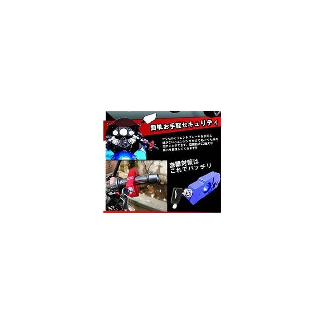 盗難対策はこれでバッチリ!<BR> ◆簡単お手軽セキュリティ<BR> アクセルとフロントブレーキを固定し<BR> 鍵がないとエンジンをかけてもアクセルを<BR> 回すことができず、盗難防止に絶大な威力を発揮してくれます!!<BR> ◆ハンドルとブレーキをガッチリLOCK!!<BR> 毎年、多発するバイクの盗難<BR> 他人事だと思っていると危険です!!<BR> 一度固定してしまえば、鍵なしでは外せません!<BR> 商品サイズ:約14×6cm<BR> 穴直径:約3.5cm、約2cm<BR> 付属:鍵×2<BR> カラー:レッド<BR> 念の為、バイクに固定する前に開錠可能かどうか確認 をお願いいたします<BR> ※保証は、初期不良時のみの対応となります。<BR>