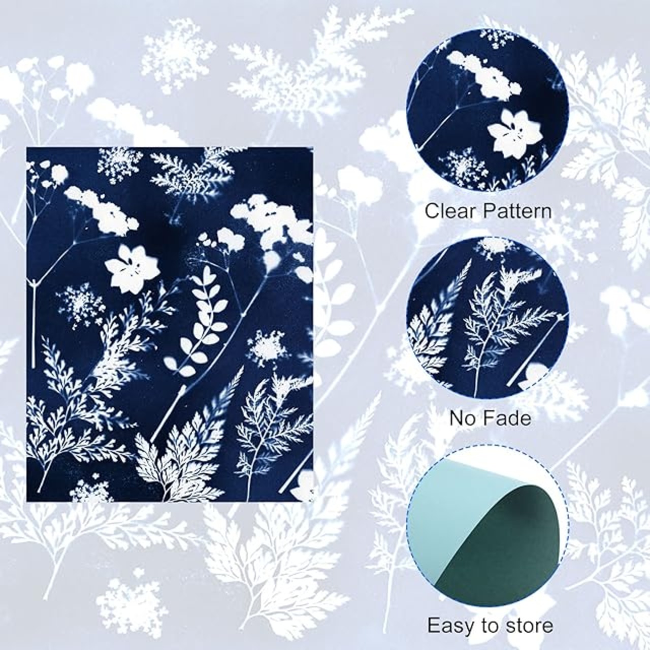 説明: 1. シアノタイプ紙の上に植物などを置き、透明なガラスまたはアクリル板で固定します。2. 約10分間太陽の下に置きます。3. 物を取り除き、紙を水で約2分間すすぐと、画像が表示されます。4. 乾かして、飾りたい場所に飾ってください。