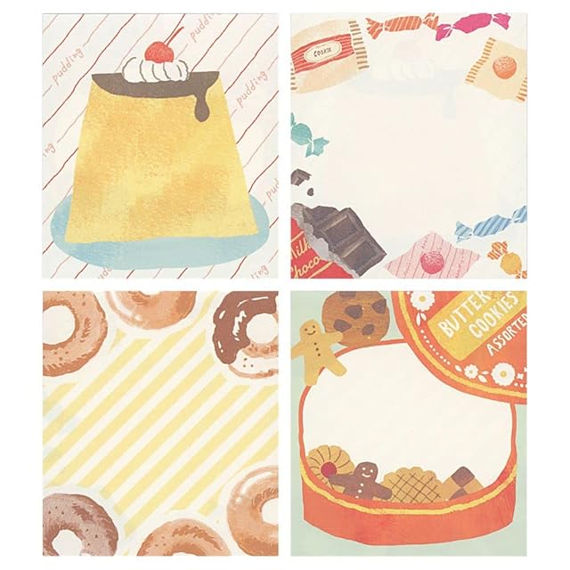 たっぷり100枚綴りのメモブロック!。25枚×4柄も入っているので気軽に使えるのも嬉しいポイント♪。メモはもちろんですが、手帳やノートのデコレーションでも大活躍!。使うたびに柄を選ぶのが楽しくなること間違いなしです。。。・100枚綴り(4柄アソート)90×80mm。。サイズ:縦=90mm 横=80mm 。表紙パターン:その他お菓子。