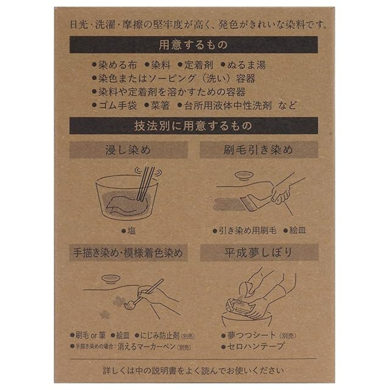 染められる目安:浸し染めの場合-1色につき布約50g、刷毛引き染めなどの場合-ハンカチ(45cm角)約2~6枚