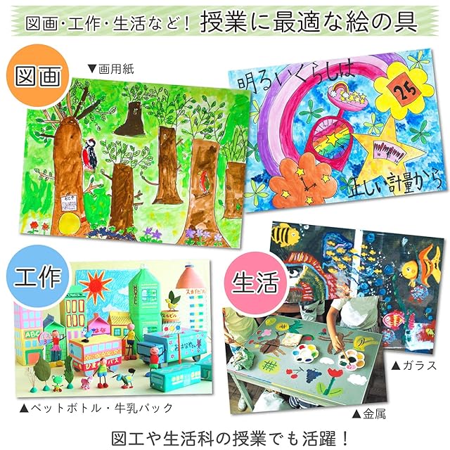 【特長1】マット水彩の優れた描画特性にペットボトルや牛乳パック等のいろいろなものに描ける機能を追加