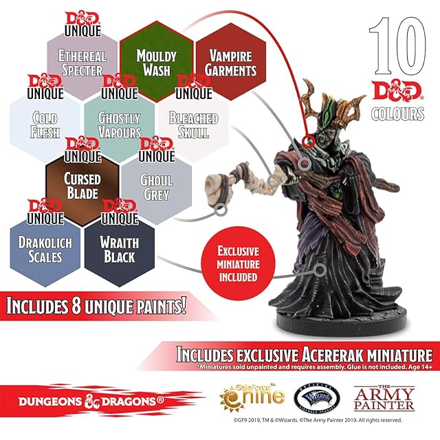 生きている生き物以上のD&Dの世界をもたらすものは他にありません – そして巨大なヒーローから悪いモンスターの出会いまで、ペイントされたミニチュアと遊んでいるということは、あなたの前に冒険が現れます。 ダンジョンズ & ドラゴンズ アンデッドペイントセットには、10色の高品質でユニークな色が含まれています。想像するかもしれないアンデッドな生き物にマッチするように特別に色付けされています。 Warpaints は、細かいミニチュアをペイントするために特別にデザインされた高品質のアクリルペイントです。 この塗料はクリーミーな濃度で、顔料が非常に豊富で、100% 無害で、常に完璧なマット仕上げを実現します。 D&D Adventurer's ペイントセットとの併用をお勧めします。