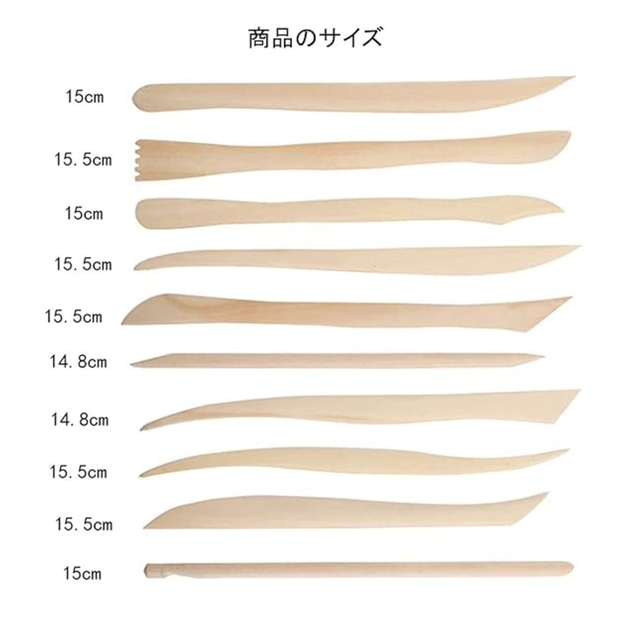 【商品仕様】材質:ウッド ; サイズ:14.5-15.5cm(写真をご参考にしてください); パッケージ:10本セット; 特徴:木製なので軽くて指感触がいいです。粘土、クレイ、彫刻などにおすすめです。