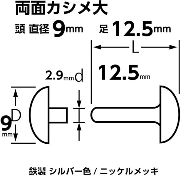 D:頭の直径 9mm d:足の直径 2.9mm L:足の長さ 12.5mm カラー&鍍金:シルバー色(ニッケル鍍金)100組セット