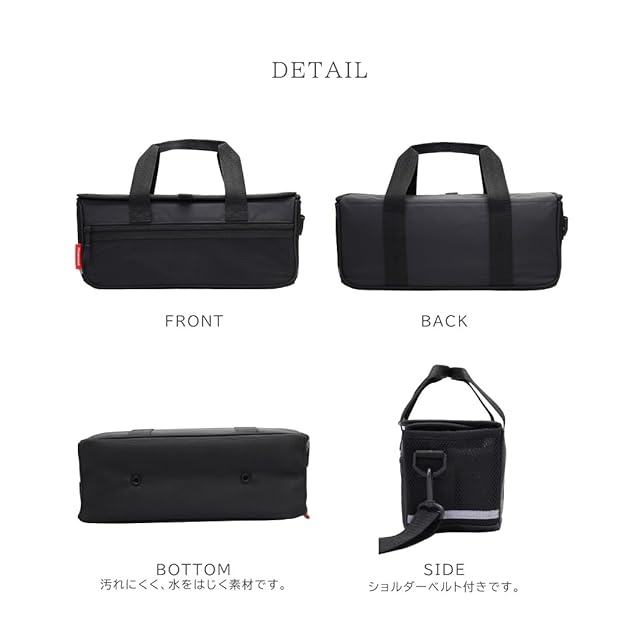 汚れが目立ちにくい、黒い布地のシンプルでスタンダードなバッグです。目が細かい生地のため水をはじきやすいです。表面にメッシュポケットがついています。