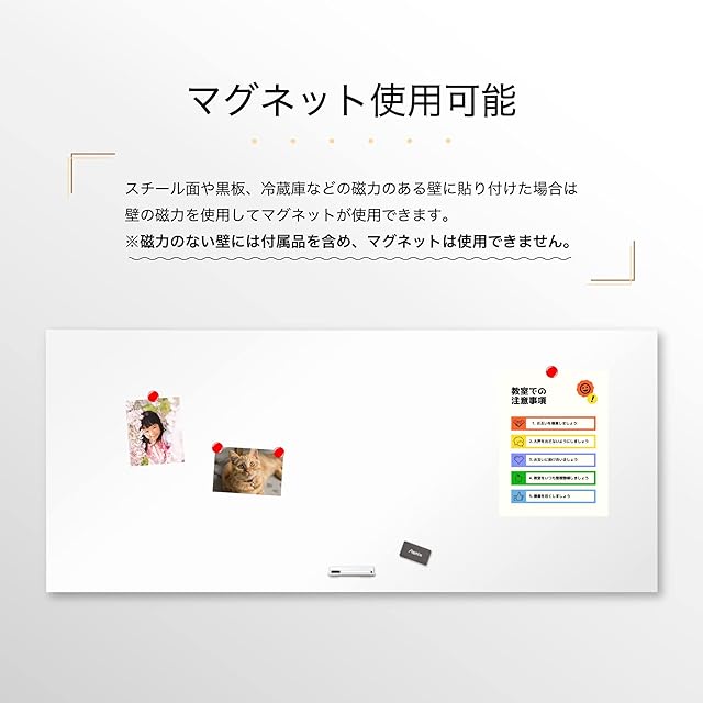 マーカーを使って伝言や予定を書いたり、プレゼンや授業、プロジェクター壁面など様々な用途で活用できます。
