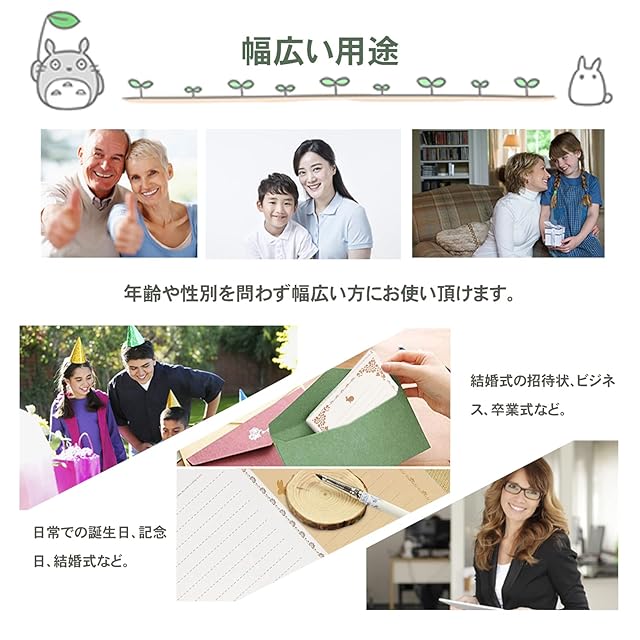 【用途】 日頃の感謝の言葉や、言葉で表現するのが難しい感謝の気持ちを手書きのメッセージで伝えます。日常でのバースデーカード、記念日などはもちろん、結婚式の招待状、ビジネスの招待状、卒業式、クリスマスと新年のカード、ラブレター、その他のエチケットの場面にも非常に適しています。