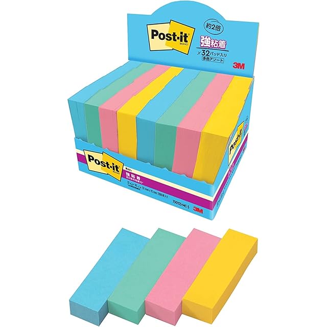 カラフルな4色のセットなので、色で識別したり、書いた部分を目立たせたりすることができる。約2倍の粘着力*で垂直面にもしっかり貼れ、くり返し貼ったりはがしたりできます。*ポストイット 通常粘着製品比