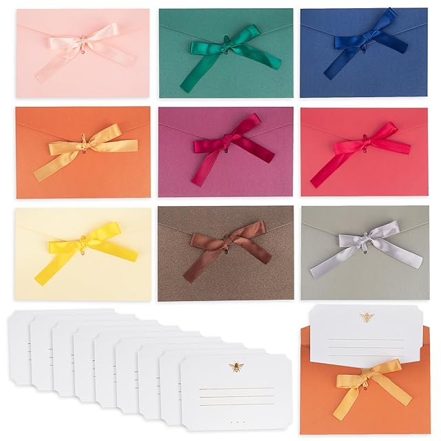 【デザイン】封筒はリボン付きで、簡単に蝶結びができます。色彩が豊富で、表面にはパールのような光沢があります。カードは箔押し加工で、蜂のデザインが施され、シンプルながらも高級感を演出します。