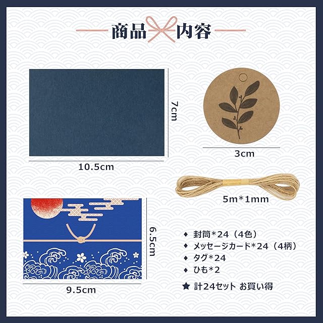 [TEMLUM] メッセージカード ミニ型 感謝カード 和風柄 グリーティングカード 4種類 封筒付き 水引き タグ 挨拶状 24枚セット お祝い 結婚式 記念日 よろしく めでたい プレゼント(和風) | HiKaRiストア