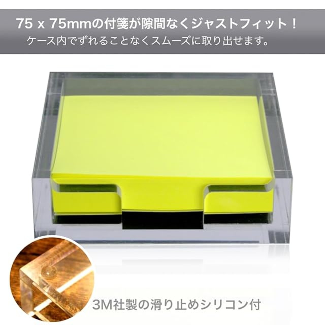 <b>✅【 「付箋どこにやったっけ?」がなくなります 】</b><br> デスクで付箋が見つからない・・・。付箋の端が折れ曲がってる・・・。GemRichの卓上付箋ホルダーを使用することでこのような煩わしさがなくなります。 GemRichの付箋ホルダーはシンプルなデザイン性と使いやすさを備えるアイテム。付箋をスムーズに取り出すことができ、付箋がバラバラになることもありません。クリアで厚みのあるアクリルは高い耐久性と安定感を備えデスクをすっきりとさせます。<br><br> <b>✅【 いつもの付箋がもっと便利に 】</b><br> GemRichの付箋ホルダーは75mmサイズの付箋がジャストフィット。ホルダー内の隙間をなくすことで、取り出す際に付箋が動かずストレスなく取り出すことができます。また、前面に備えられた指穴スリットによりスムーズに付箋をめくることが可能。背面に貼り付けることのできる3Mの滑り止めシリコン x4 も付属し、付箋を使う際の便利さがアップします。<br><br> <b>✅【 スッキリとしたデスクに必須のアイテム 】</b><br> GemRichの付箋ディスペンサーは全面クリア色。シンプルで洗練されたデザインはデスクオーガナイザーとしてオフィスやデスク周りを整理するのに最適です。 ポストイットなど一般的な正方形のふせん75mm x 75mm (0.75cm x 0.75cm) サイズに対応。本製品に付箋は付属していませんので別途対応サイズのふせんとあわせ買い求めください。<br><br> <b>✅【 耐久性が高い高品質素材 】</b> <br> 厚みのあるアクリル製品は高級感と同時に高い耐久性を備えています。自宅やオフィスでも置き場所の雰囲気を選ぶことがありません。 適度な重みがあるのでメモパッドや電話メモとしてだけでなく、ペーパーウエイトとしても使用いただけます。<br><br> <b>✅【 安心の日本ブランド/30日保証付 】</b><br> GemRichの付箋ホルダーは飽きることないシンプルで高級感のあるデザイン。クリア色なので置き場所に左右されずどんな場所にもマッチします。プレゼントやギフトにも最適です。類似品・模倣品 にご注意ください。商品到着後の初期不良はもちろんのことイメージ違いなどについても、全額返金あるいは無料交換にて対応させていただきますので安心してお買い求めください