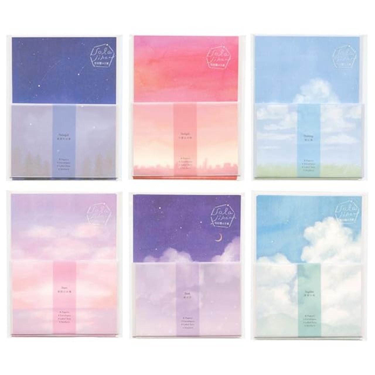 夜明けから真夜中、1日の始まりから終わりまでの空を水彩で描いた「空時間の手紙」のレターセットシリーズ。。。手紙を書くときの時間や気持ちに合わせて色とりどりの空を楽しめます。宛名ラベルと紙飛行機形の封かんシールに、太陽や星の光をイメージしたキラキラしたシルバー箔が施されています。封筒はトレーシングペーパーを使用して、うっすらと便箋が透けて霧がかかった様な景色を演出します。。。内容。・便箋×同柄8枚(185×135mm)。・トレーシングペーパー封筒×4枚(95×142mm)。・宛名ラベル×4枚。
