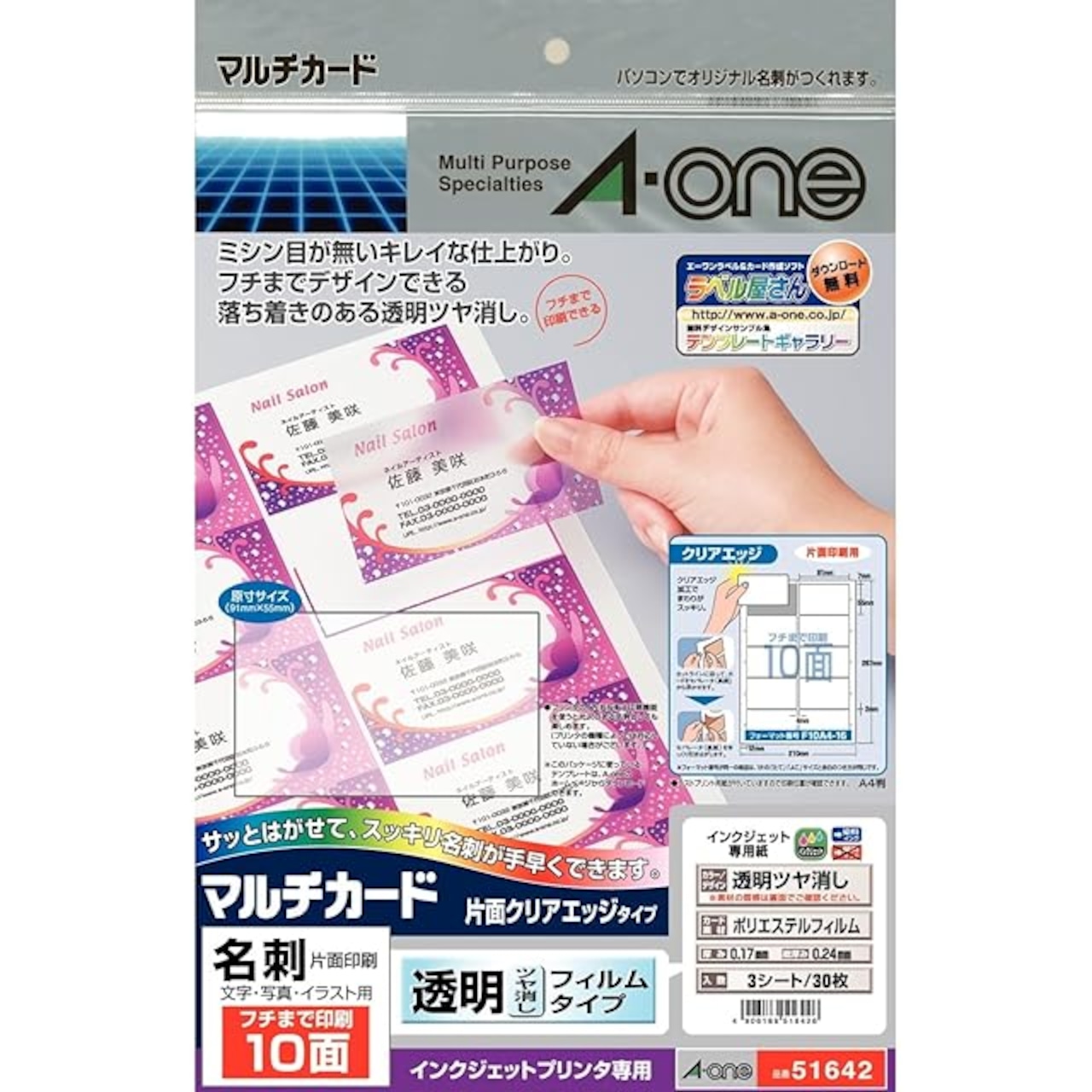 エーワン 名刺 マルチカード 透明ツヤ消し フチまで印刷 30枚分 51642