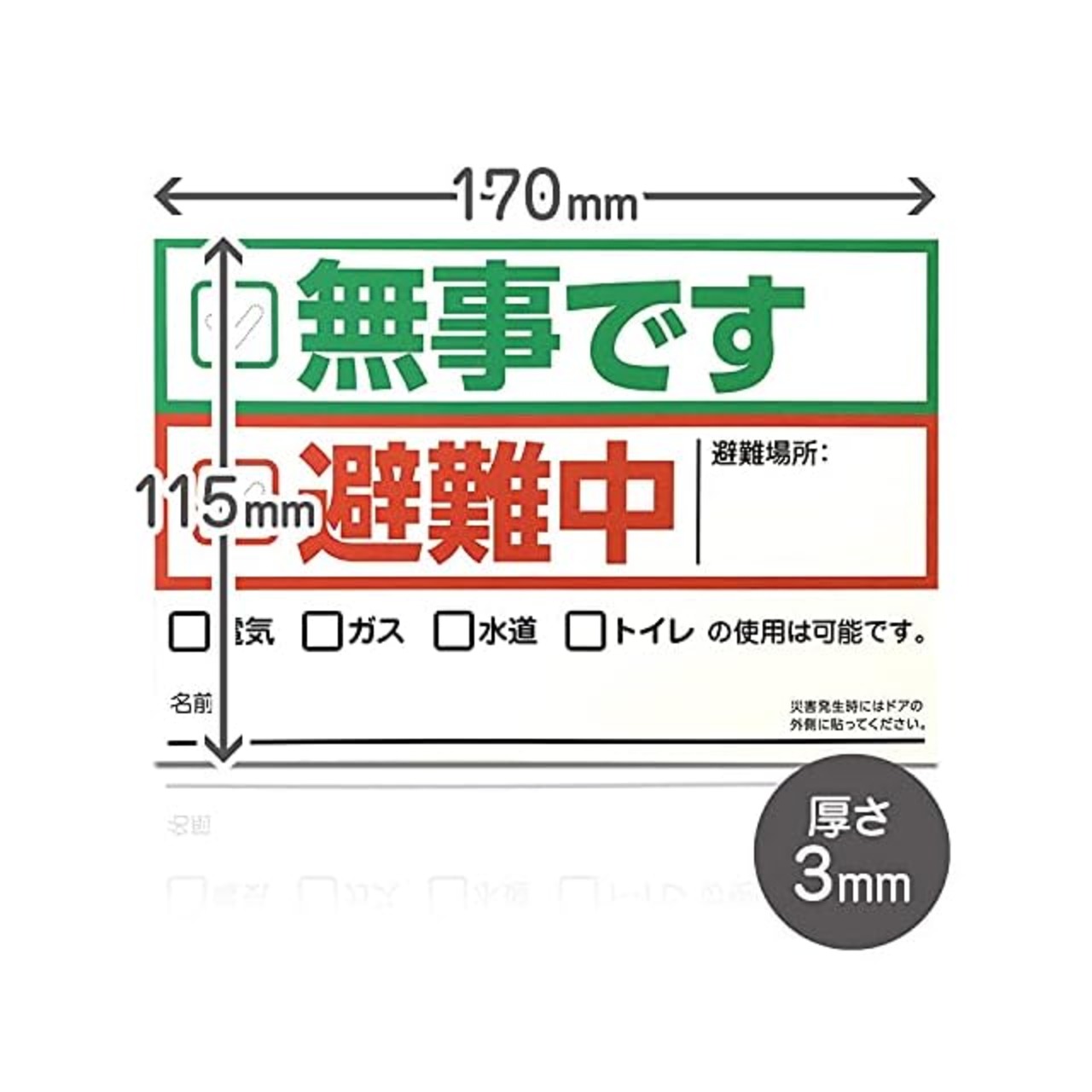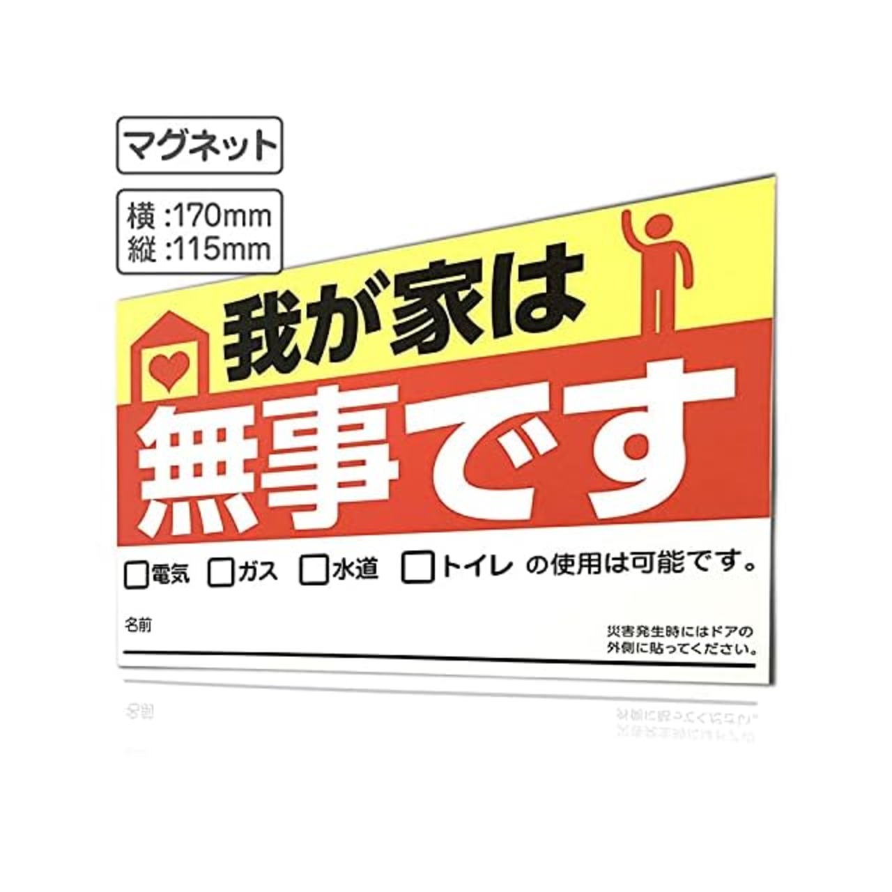 大地震などの災害時に玄関のドアの金属部分に、「安否確認マグネットシート」を貼るだけで自治体や近所の方々などの救助者が一目でわかるシートです。<br> 一枚の安否確認シートが災害時の救助活動にとって大きな役割を果たします。<br><br> 【ご使用方法】<br> シート面の裏側がマグネットになっているので、緊急の際は玄関ドアの外側に貼ってください。<br> ※玄関ドアがアルミ製の場合はマグネットが張り付きませんのでご使用できません。<br><br> 【商品仕様】<br> ●サイズ:170×115×3mm<br> ●材質:PVC(裏面マグネット)、UV印刷加工<br> ●生産国:日本<br><br> 【使用上の注意】<br> ・汚れた場合は中性洗剤等で軽く拭き取ってください。<br> ・玄関ドアがアルミ製の場合はマグネットが張り付きませんのでご使用できません。<br> ・無理に折り曲げたりしますと、印刷面にヒビが入ってしまいますのでご注意ください。<br><br> ※デザインなどは予告なく変更する場合があります。