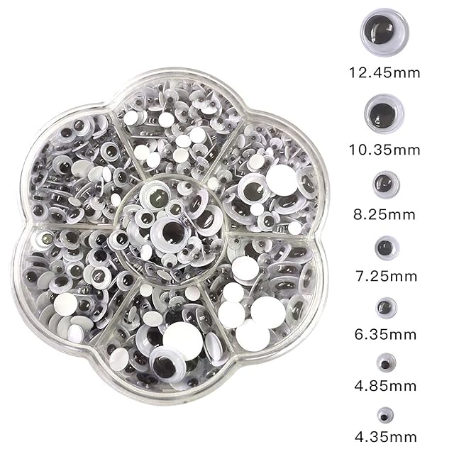 黒目:可動タイプです、裏面は両面テープになっています。 収納ボックス付き、7サイズが揃っています。