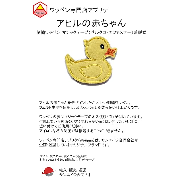 アヒルの赤ちゃんをデザインしたかわいい刺繍ワッペンです。<br> フェルト生地を使用しているので、ふわふわとした柔らかい感じに仕上がっています。<br> <br> 普段のファッションのアクセントやサバゲー(サバイバルゲーム)、ミリタリーファッションにおすすめ!<br> <br> ワッペンの裏にマジックテープのオス(硬い面)が付いています。<br> 付属している片面のメス(やわらかい面)は、付けたいものに縫い付けてご使用ください。<br> アイロンなどの熱圧では接着することができません。<br> <br> サイズ:横8.2cm、縦7.8cm(最長部)<br> 材料:フェルト生地、刺繍糸<br> 取付方法:マジックテープ<br>