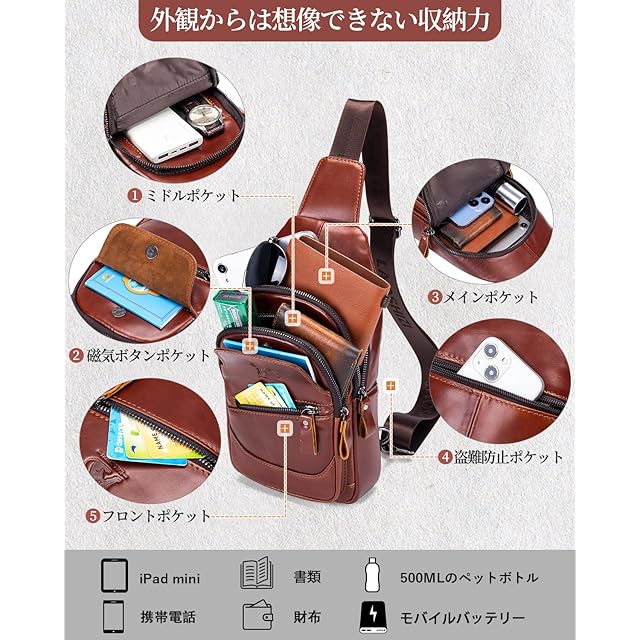 [YESLAU] ショルダーバッグ メンズ ボディバッグ 本革 防水 肩掛けバッグ 斜めがけバッグ ワンショルダーバッグ 大容量 USBポート付き 斜めがけ iPad収納可能 人気 通勤 旅行 盗難防止 (ブラウン) | HiKaRiストア