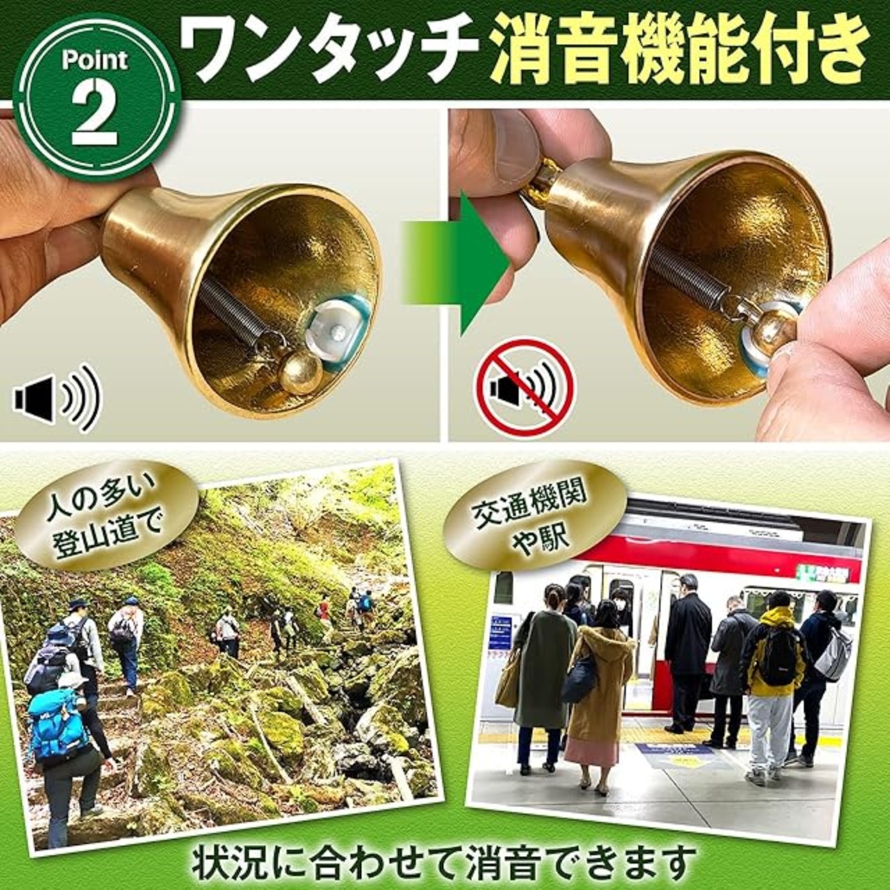 ワンタッチで簡単に消音できる「消音機能 *意匠権登録済」が付いてます。 交通機関や駅等の公共の場所、人の多い登山道では消音機能を使って音を出さないようにすることができます。