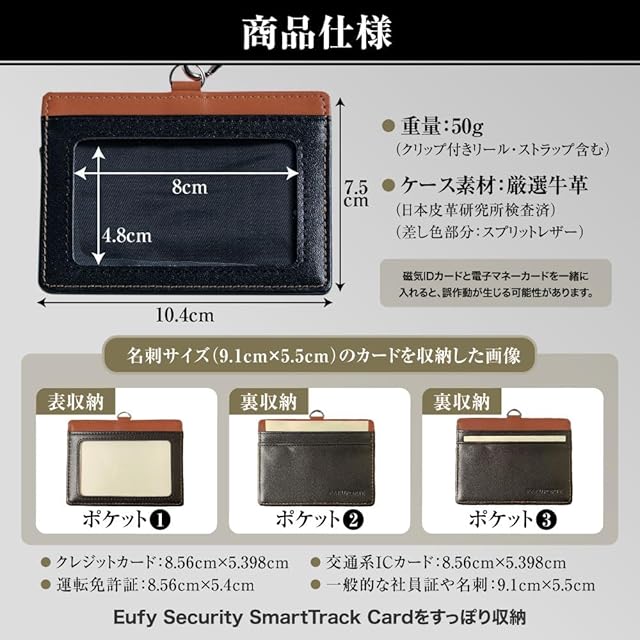 【商品仕様】サイズ :ケース7.5cm×10.4cm×0.4cm/透明部分4.8cm×8cm/透明部分:クリア/重量:50g(リール・ストラップ含む)/ケース素材:牛革/ストラップ:合皮/カードポケット:Eufy Security SmartTrack Cardをすっぽり収納。表1裏2 *磁気IDカードと電子マネーカードを一緒に入れると誤作動が生じる可能性があります。