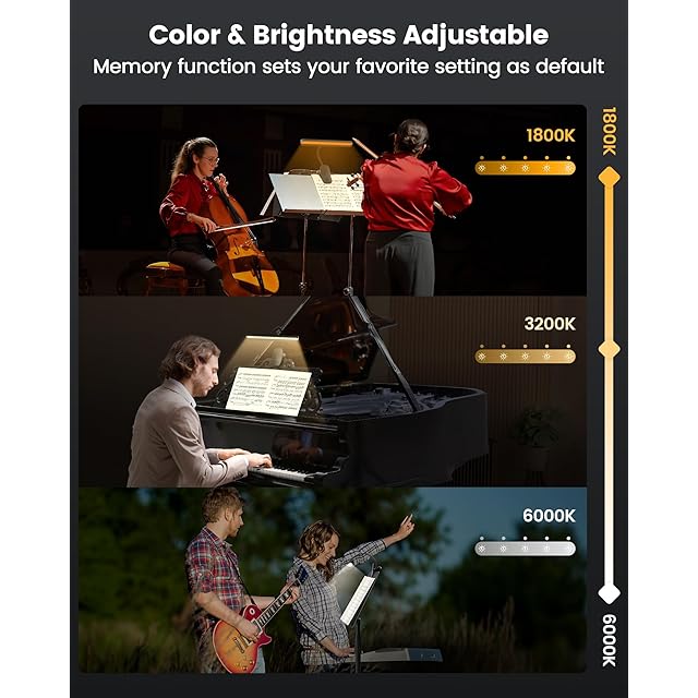 【3色調光 & 5段階調節機能】他社のピアノライトにはない、目に優しい1800Kアンバーモードを採用。1800Kから6000Kまでの色温度調節と、20ルーメンから150ルーメンまでの明るさ調節が可能で、屋内・屋外を問わずあらゆる演奏環境に最適な照明を提供します。理想的な練習補助ライトです。
