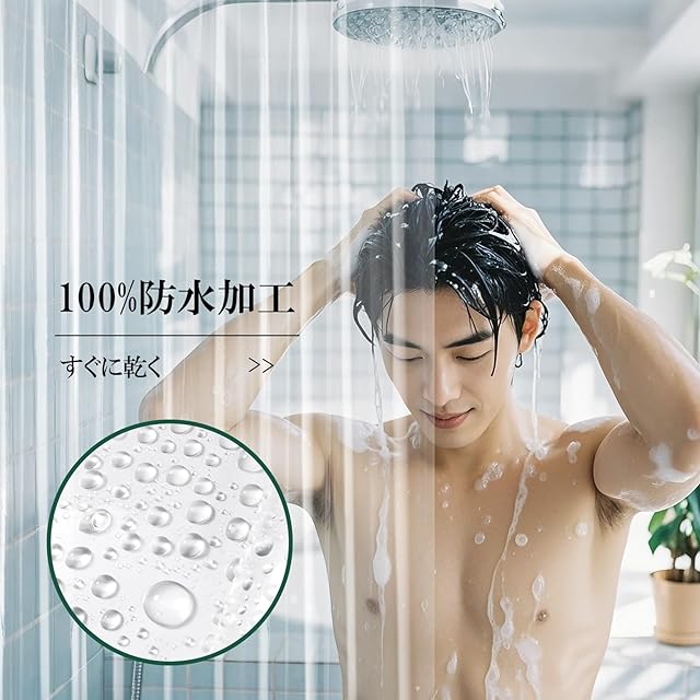 【透明度】シンプルな透明シャワーカーテンなので、バスルームがいつも明るく見えます。バスルームはもちろん、ホテル、浴室、洗面所、トイレ、キッチン、職場更衣室、美容院、車庫、暖房室、和室、事務室、コンビニの目隠しや間仕切りにも活躍します。
