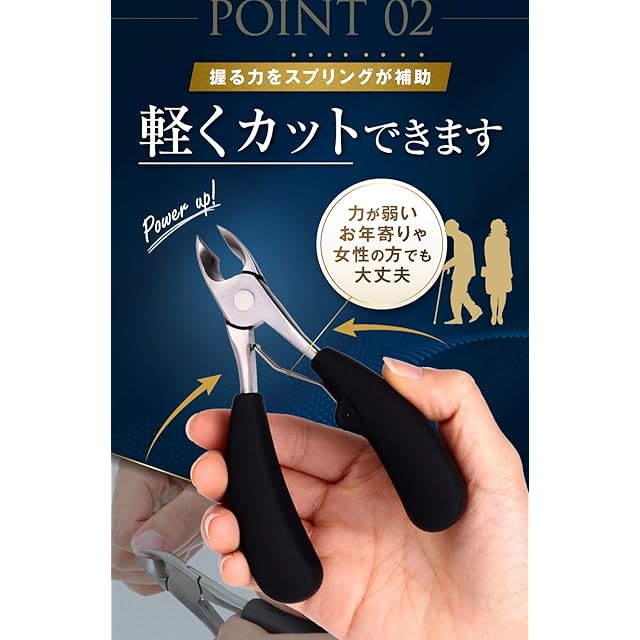 軽くキレイに美しく切れるニッパー式爪切り ステンレス製の鋭利な刃先で爪の細かいところまで切れる 爪のトラブルでお悩みの貴方に 巻き爪、陥入爪、硬い爪、分厚い爪、変形爪、 爪水虫、深爪、爪割れ 、二枚爪 爪でお悩みの方は是非お試しください。 手足両用。カーブ状の刃先で、切りにくい爪の端までカットできます。 握りやすいソフトグリップとバネの力の補助で、通常のつめきりの半分の力でスパッと切れます。 刃の先端を使い、小刻みにカットする事で深爪の心配もなくなります。切った爪も飛ばなくなり、爪に負担をかけず、健康的な爪を手に入れられます。 付属のゾンデと爪やすりで、美しく魅力的な爪を作れます。