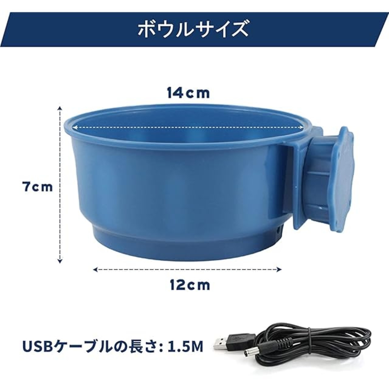 ボウルの深さ:7cm、幅:12cm、容量:600ml。ドライドッグフッドも加熱可能。出力10wで、省エネルギー。