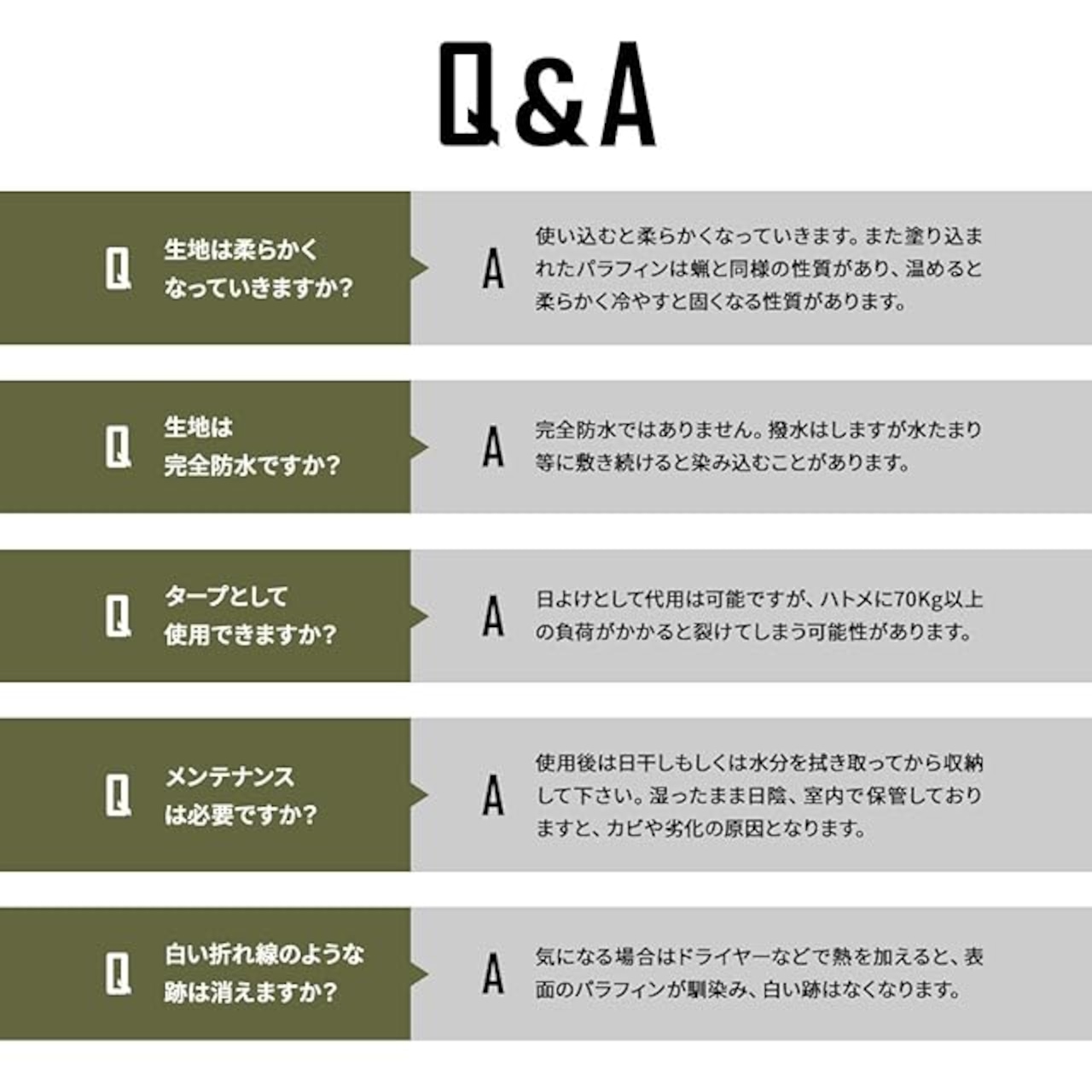 【圧倒的な撥水性を可能にしたパラフィン加工】 綿帆布に蝋引き加工(パラフィン加工)を施すことで、圧倒的な高撥水性のグランドシートを実現。不意に飲み物や料理をこぼしてしまっても、サッと拭き取るだけで汚れが取れます。また、グランドシートとしてだけでなく、急な天候の変化で雨が降った場合に大切なギアを一時的にカバーしたり、雨除けとして利用できます。