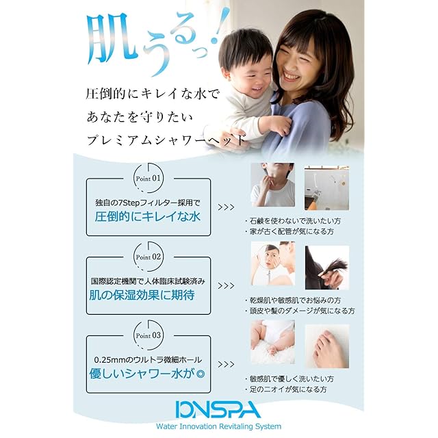 イオンスパの驚くほどやわらかで高い洗浄力により「肌や髪の毛が潤っている」「乾燥肌が気にならなくなった」「お湯だけなのにお肌がつるつるになった」「足のニオイが気にならなくなった」(※あくまで個人の感想です。)など多くの嬉しいコメントを頂いております。是非、プレミアムシャワーヘッド「イオンスパ」で、毎日のシャワータイムを是非お楽しみください!また、ギフトとしても大変おすすめです!