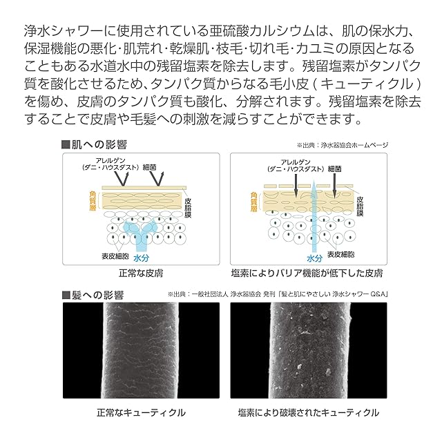 浄水シャワーに使用されている亜硫酸カルシウムは肌の保水力、保湿機能の悪化・肌荒れ・乾燥肌・枝毛・切れげ・かゆみの原因となることもある水道水中の残留塩素を除去します。残留塩素がたんぱく質を酸化させるため、たんぱく質からなる毛小皮(キューティクル)を傷め、皮膚のたんぱく質も酸化、分解されます。残留塩素を除去する事で皮膚や毛髪への刺激を減らす事ができます。