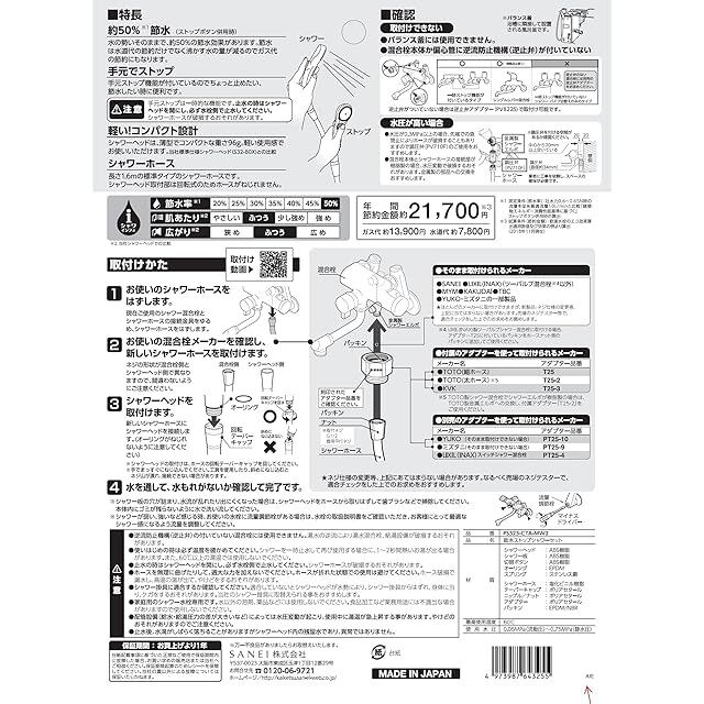 <そのまま取り付けられるメーカー>・SANEI ・MYM ・KAKUDAI ・TBC ・LIXIL(INAX)《ツーバルブシャワー混合栓※/バランス釜以外》 ・ノーリツ ・YUKO・ミズタニの一部製品※LIXIL(INAX)製ツーバルブシャワー混合栓に取付ける場合、アダプターT25についているパッキンをホース金具側のパッキンに追加してご使用ください。<付属のアダプターで取付けられるメーカー>・TOTO(細ホース) ・TOTO(太ホース) ・TOTO(樹脂製エルボ) ・KVK ・ガスター(東京ガス) ・LIXIL(INAX)バランス釜 ・リンナイ・大阪ガスの一部製品<別売のアダプターで取り付けできるメーカー:品番 PT250-9>・YUKO(そのまま取付けできない場合) ・ミズダニ(そのまま取付けできない場合) ・リンナイ・大阪ガスの一部製品(T25-7で合わない場合)・LIXIL(INAX)スイッチシャワー混合栓