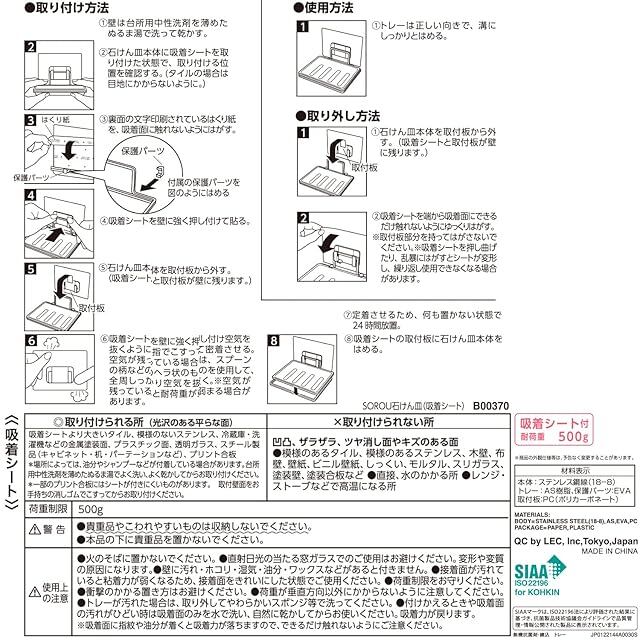 くり返し使える吸着シートで壁面に取り付けられる石けん皿です。