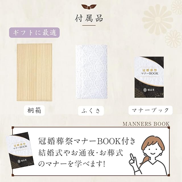 冠婚葬祭マナーBOOK付き、結婚式やお通夜・お葬式のマナーを学べます!