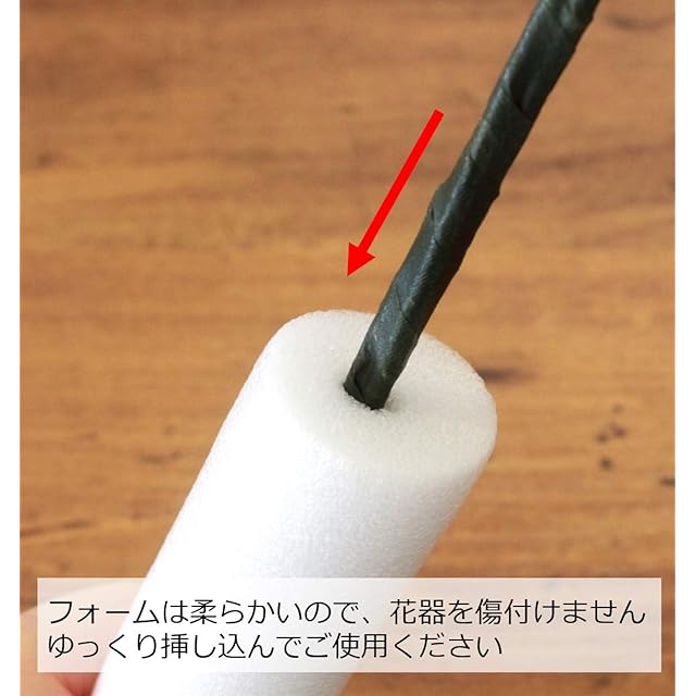 国内(埼玉県川越市 山久)でひとつひとつ、葉のふくらみを確認しながら、手で組んで作っています。 茎がフローラルテープで固定されているため、花器に引っ掛かりづらく使いやすいタイプになっております。 お榊を花器に入れた時の見栄えにこだわり、大きめの榊立てでも使用できるよう、花器固定用の円筒型スポンジをお付けしています。