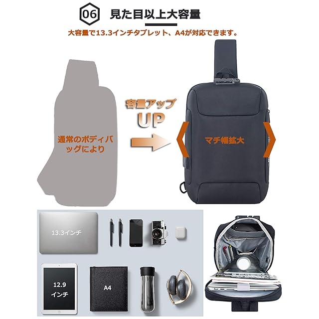 大容量で13.3インチPC、12.9インチIPAD、A4が対応できます。バッグの背面に盗難防止ポケットが付いており、貴重品の収納にお勧めです。また、ショルダーバッグの背部はメッシュ素材を採用、通気性が良くて暑い日でも楽に使えます。