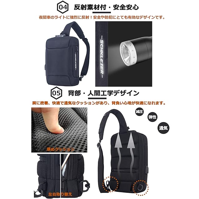 【通気性】背面にメッシュ加工を採用することにより、一般的なボディバッグよりも通気性が良くなっており、蒸れを防ぎ暑い日でも快適に使用いただけます。快適さに工夫して、重い物を背負いしてもショルダーが痛くないです。人体工学に基づいた通気クッションのデザインはこのバッグを負うことを忘れさせないほど快適感を与えます。