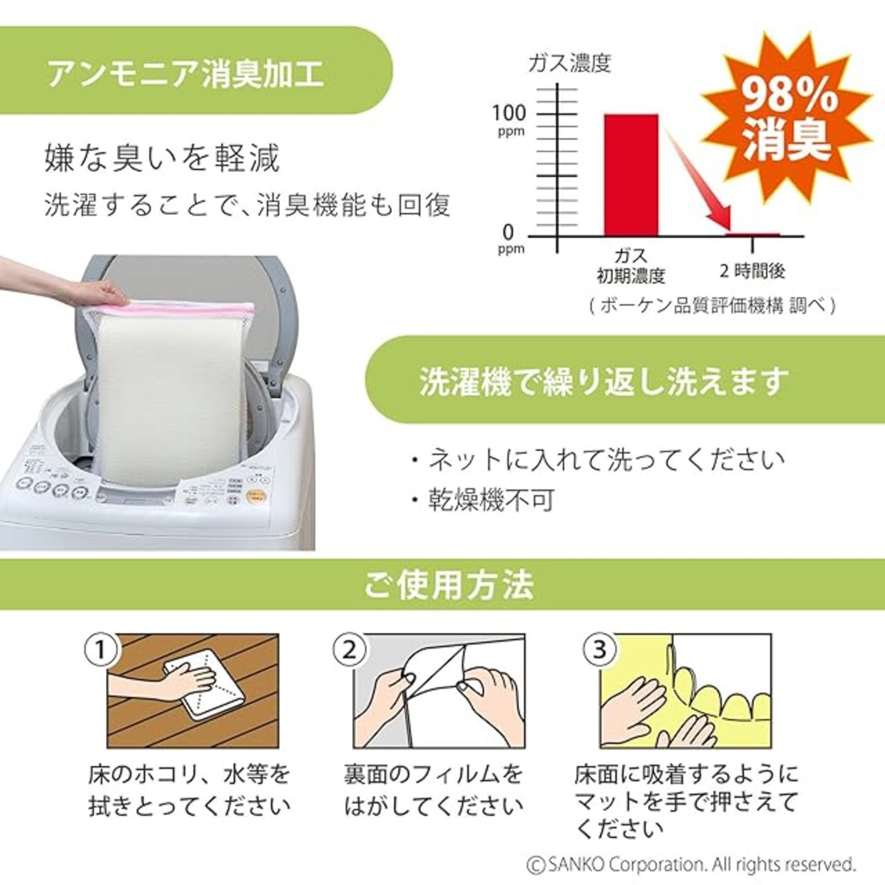 特徴:カットOK、アンモニア消臭加工、洗濯機可(乾燥機不可)、吸着タイプ(掃除機を掛けても吸いあがらない吸着力)