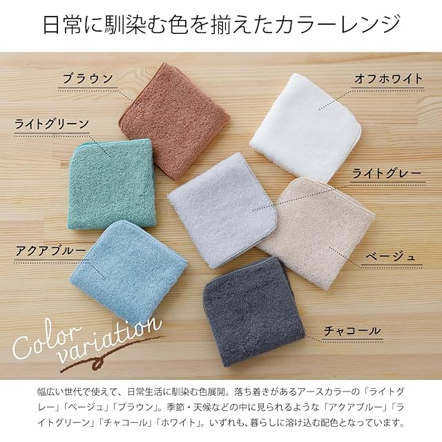 【拭き残し感ゼロへ】生地を織り上げた後に綿花の油分や不純物・糊を洗い落とす「後晒し製法」により吸水性に優れ、使い始めから拭き残し感が感じにくいです。※柔軟剤の使用は吸水性を疎外するので、できるだけ使用しないでください。