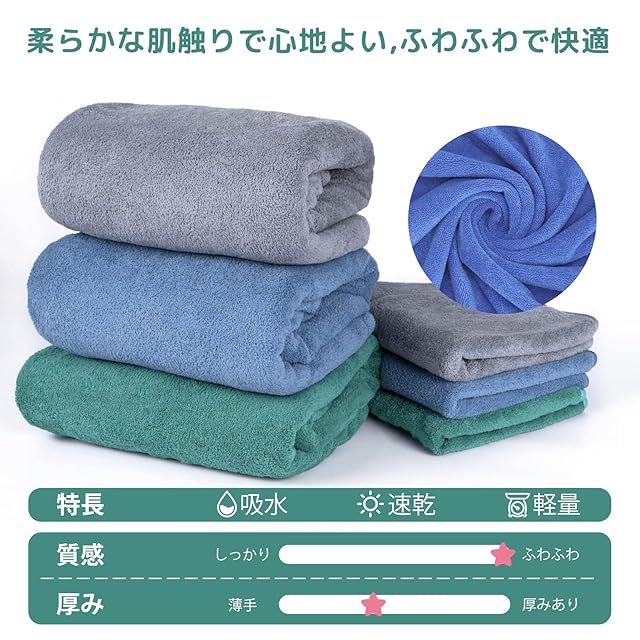 優れた通気性と速乾性吸水性を持っています: マイクロファイバー素材はなめらかで心地よい肌触りです。また、通気性と吸水性に優れ、体や髪の毛をすばやく乾かします
