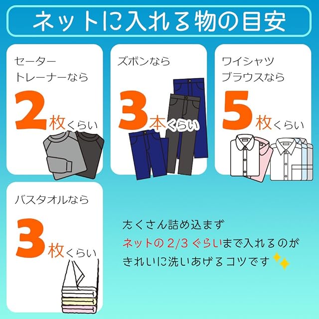 ネットに入れるものの目安:ブラウス…5枚くらい、セーター、トレーナー…2枚くらい、バスタオル…3枚くらい、ズボン…3本くらい